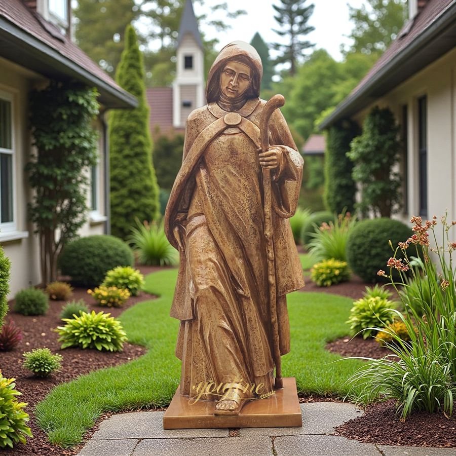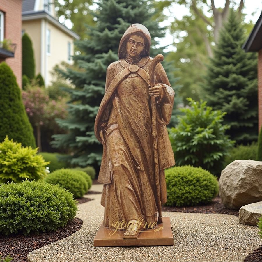 The precisely cast folds of her inner robe, the bronze surface realistically recreates the soft texture and weight of the fabric through the interplay of light and shadow. Sister Teresa holds an antique-style cane in her right hand, its natural curve suggesting the weight of time.