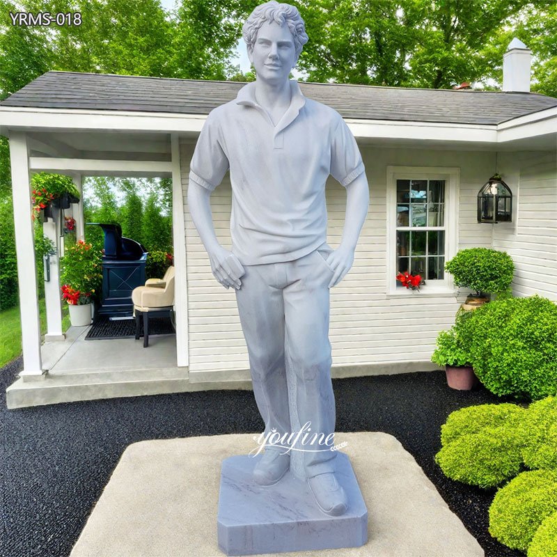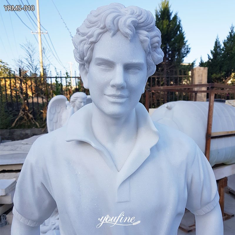The Carlo Acutis Statue, carved from natural white marble, features him dressed in a simple polo shirt and casual trousers. The clothes flow naturally, meticulously reproducing the fabric’s characteristics for a truly lifelike look.